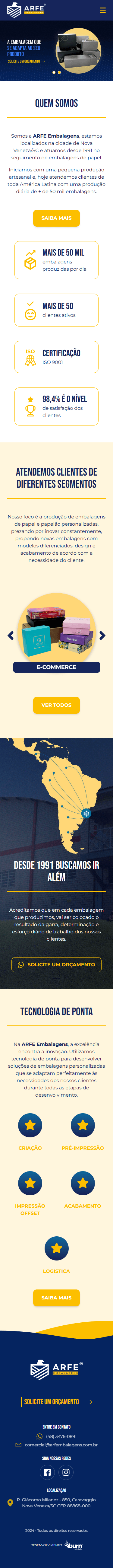 A ARFE EMBALAGENS é uma empresa baseada na criatividade e inovação. Desde 1991 buscando ir além, todos os dias, pois acreditam que em cada embalagem produzida, vai ser colocado o resultado da garra, determinação e esforço diário de trabalho dos clientes.